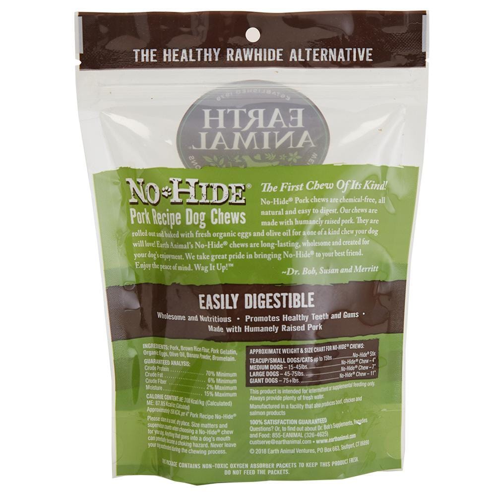 Earth Animal No-Hide? provides dogs with a healthier alternative to Rawhide. These chews are long-lasting, easily digestible and are made from hormone free Pork with no added chemicals. Pork is a rich source of minerals such as Iron, Phosphorus, Selenium, Zinc, Magnesium and Calcium. Pork is highly enriched with Vitamin B6, B12 and Thiamin. The pork has been carefully rolled, cooked, and uniquely dried for a one of a kind chew your dog will love! These chews can also promote healthy teeth and gums by assisting in the removal of plaque and tarter during chewing sessions. We always suggest giving No-Hides or any chews under supervision. Each No-Hide? Chew is proudly hand-rolled in Lancaster County, PA.