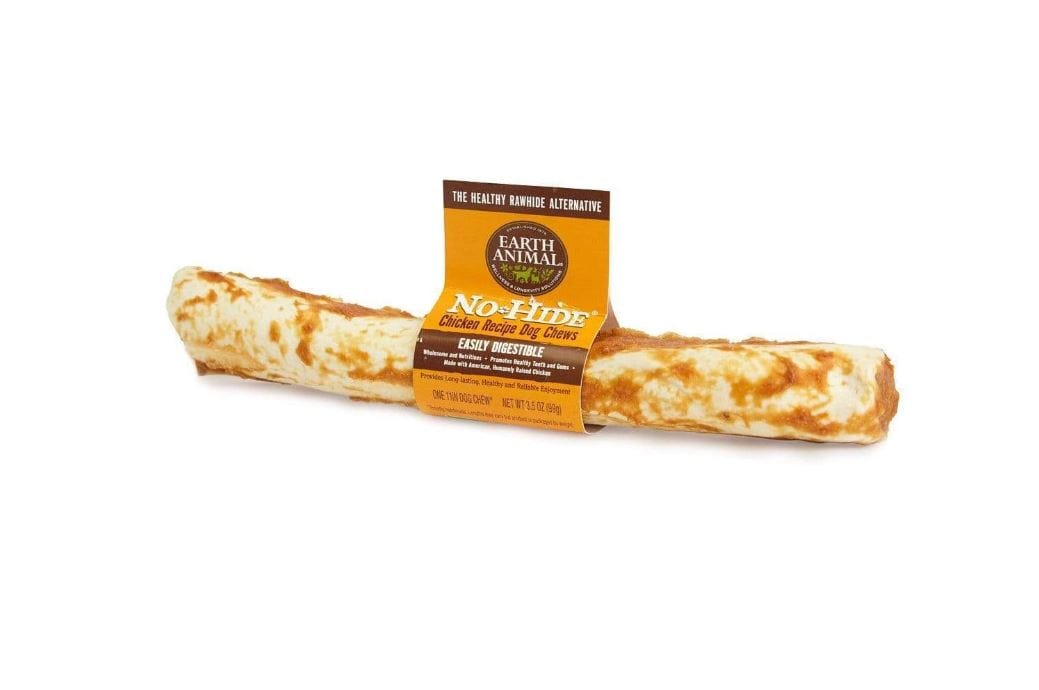 Earth Animal No-Hide is a wholesome and easily digestible chew that provides dogs with a healthier alternative to Rawhide. These chews are long-lasting, easily digestible and are made from American farm-raised chicken with no added hormones, steroids or chemicals. The chicken has been carefully rolled, cooked, and uniquely dried for a one of a kind chew your dog will love! These chews can also promote healthy teeth and gums by assisting in the removal of plaque and tarter during chewing sessions. We always suggest giving No-Hides or any chews under supervision. Each No-Hide ? Chew is proudly hand-rolled in Lancaster County, PA.