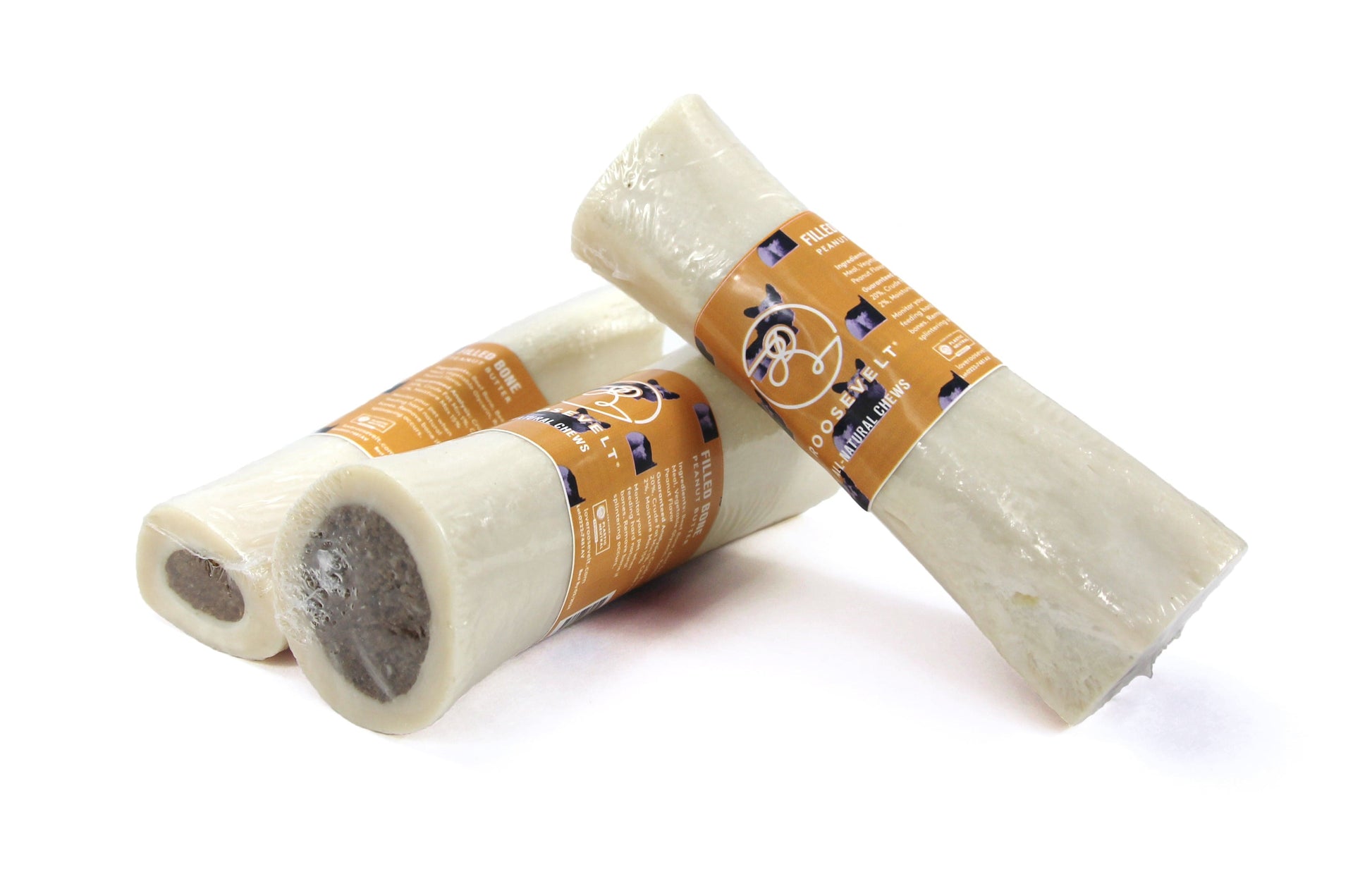 Roosevelt Peanut Butter Stuffed Bones¡ªdid someone say Peanut Butter; Natural beef bone filled with Peanut Butter flavored filling and baked. These are super tough chews that provide long-lasting relief from boredom and stress. Plus, they help support dental hygiene as they¡¯re chewed. Great for excited chewers.